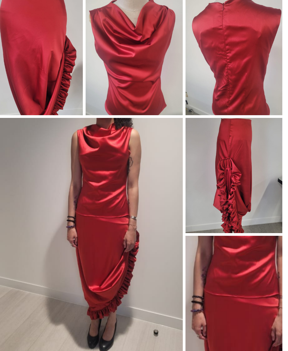 satin for a smooth, sculptural silhouette. Designed as a matching set of a draped top and gathered skirt,